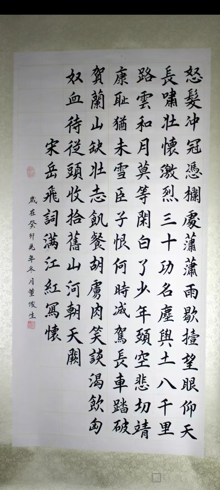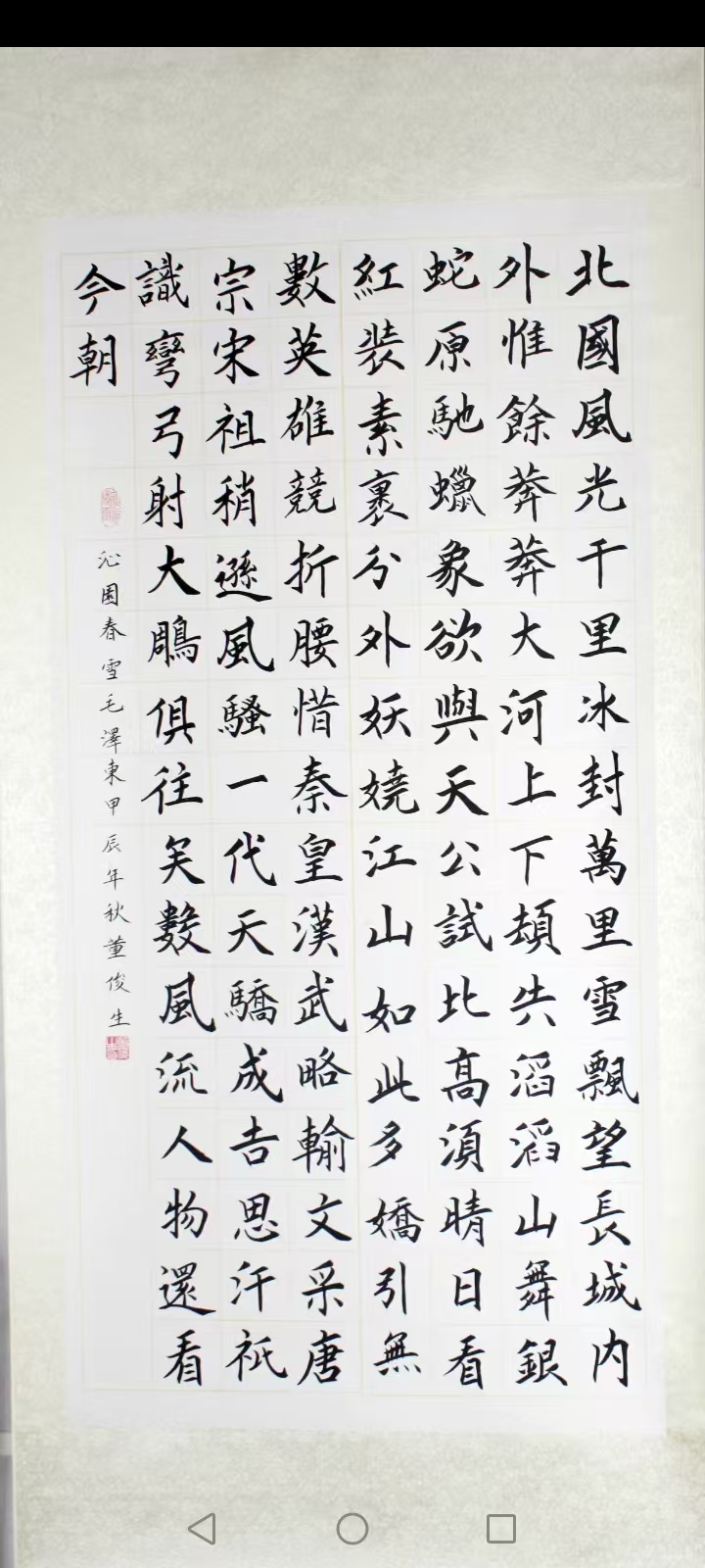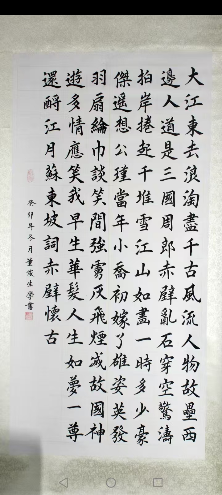 • 董俊生,男,1956年7月出生,山西省娄烦县人,大专学历,中共党员,1976年2月参加中国人民解放军,隶属原北京军区守备第一师二团,先后任战士,班长,排长,参谋,1987年转业,先后在山西省古交市党史办,市供销联社,市外贸工作,历任科员,办公室主任,经理,总经理,书记,太原外贸加工厂副厂长,企业改制后下海经商,2017年退休,零基础开始自学书法,先后临摹欧阳询《九成宫禮泉铭》,欧阳通《道因法师碑》,颜真卿《颜勤礼碑》,柳公权《化都寺碑》,王羲之《曹娥碑》,赵孟頫《洛神赋》,以及黄自元楷书间架结构92法,严格尊守古人枝法,尤喜欢欧体,田英章,卢中南名师的楷书,善研楷书。2023年在第四届“文源杯"全国书画竟赛中获初赛二等奖,决赛状元奖,专家评审书法优秀奖。2024年在第四届德艺双馨全国赛中获榜眼奖,专家组书法比赛优秀奖,2024年第十五届“鸿儒杯"书画赛中,获书法比赛二等奖,专家评审优秀奖,2026年在兰亭杯艺术大赛中获金奖。