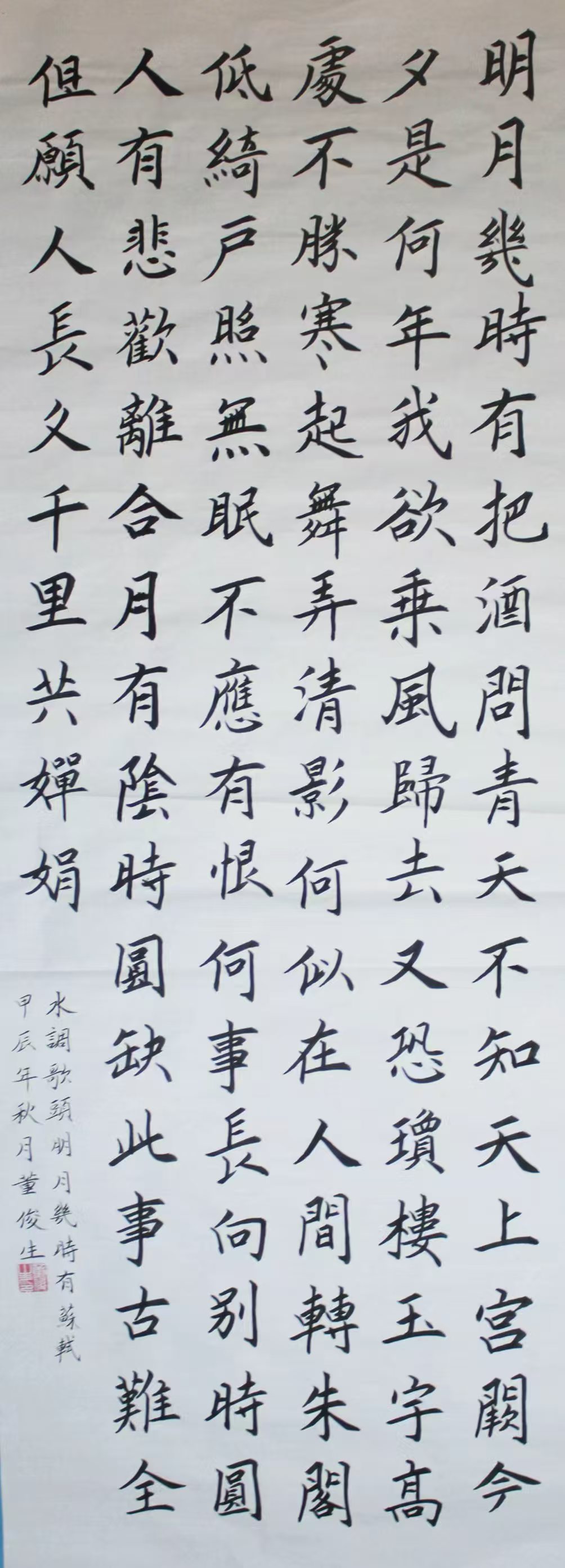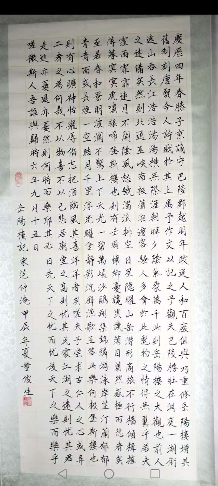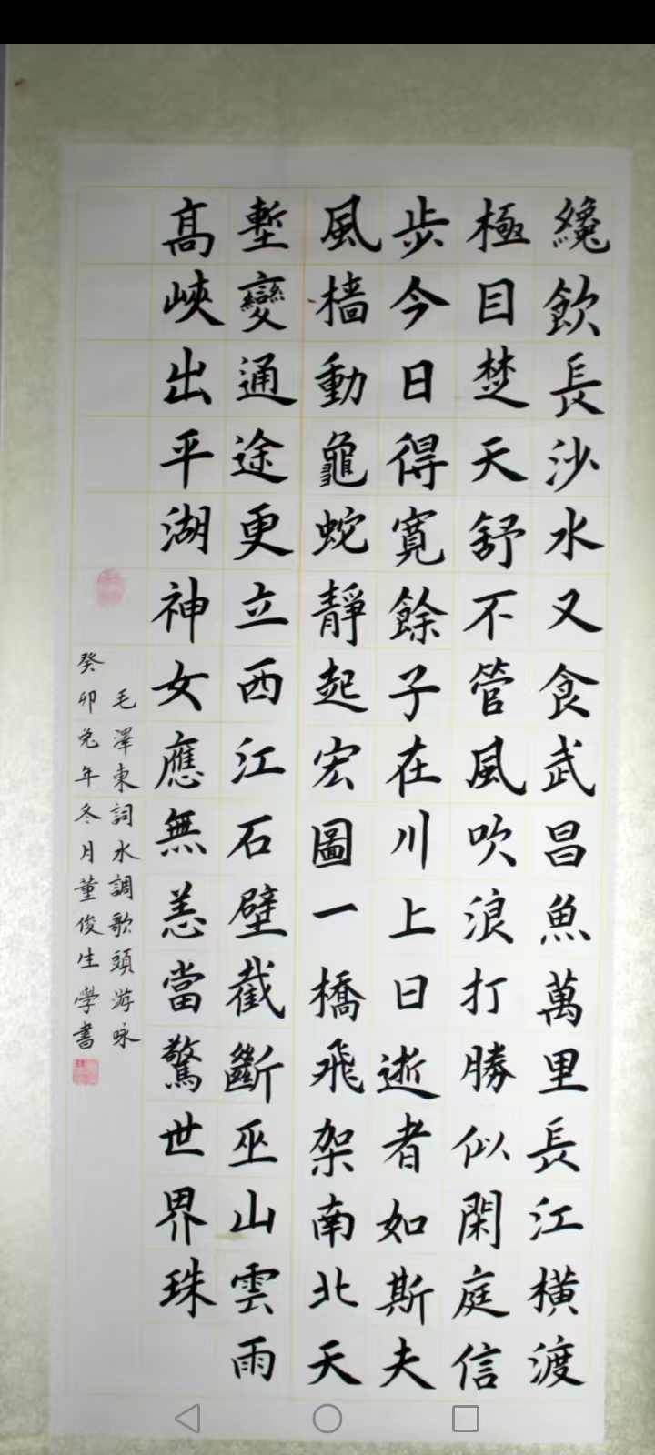 • 董俊生,男,1956年7月出生,山西省娄烦县人,大专学历,中共党员,1976年2月参加中国人民解放军,隶属原北京军区守备第一师二团,先后任战士,班长,排长,参谋,1987年转业,先后在山西省古交市党史办,市供销联社,市外贸工作,历任科员,办公室主任,经理,总经理,书记,太原外贸加工厂副厂长,企业改制后下海经商,2017年退休,零基础开始自学书法,先后临摹欧阳询《九成宫禮泉铭》,欧阳通《道因法师碑》,颜真卿《颜勤礼碑》,柳公权《化都寺碑》,王羲之《曹娥碑》,赵孟頫《洛神赋》,以及黄自元楷书间架结构92法,严格尊守古人枝法,尤喜欢欧体,田英章,卢中南名师的楷书,善研楷书。2023年在第四届“文源杯"全国书画竟赛中获初赛二等奖,决赛状元奖,专家评审书法优秀奖。2024年在第四届德艺双馨全国赛中获榜眼奖,专家组书法比赛优秀奖,2024年第十五届“鸿儒杯"书画赛中,获书法比赛二等奖,专家评审优秀奖,2026年在兰亭杯艺术大赛中获金奖。